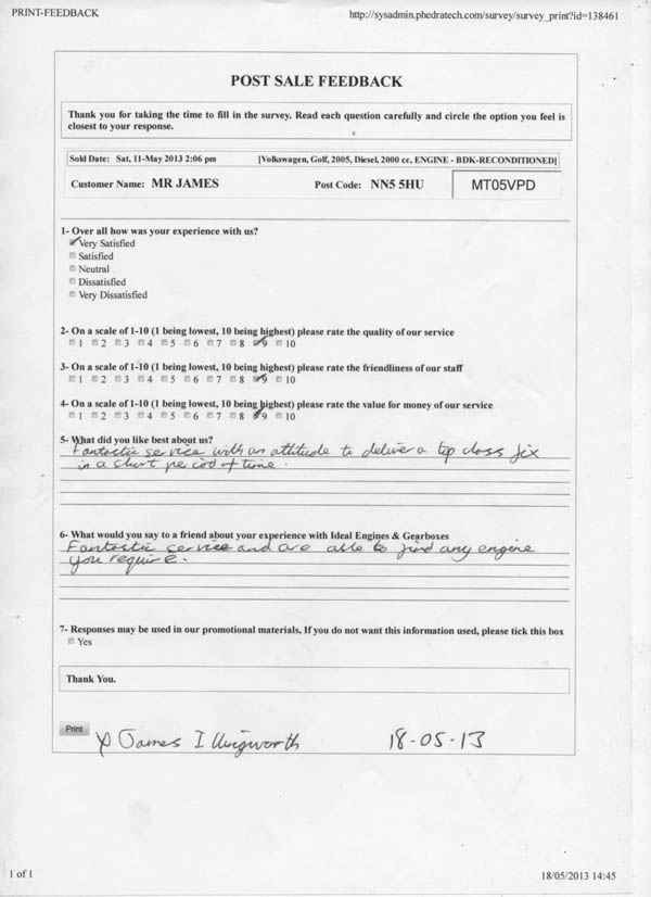 Ideal Engines and Gearboxes Review - 2005 Volkswagen Golf Diesel 2.0 Litre Engine Northampton, Northamptonshire